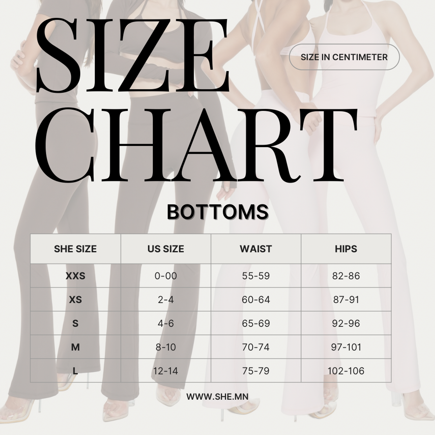 BUST: PLACE THE MEASURING TAPE AROUND THE FULLEST PART OF YOUR CHEST DIRECTLY UNDER YOUR ARMS.WAIST: MEASURE AROUND YOUR NATURAL WAISTLINE AT BELLY BUTTON LEVEL.HIPS: MEASURE AROUND THE FULLEST PART OF YOUR BODY AT THE TOP OF YOUR LEGINSEAM: WITH NO SHOES ON, MEASURE FROM THE GROIN DOWN TO THE FLOOR.UNSURE ON SIZES?CONTACT OUR STYLE EXPERTS SHE.MONGOLIA INSTAGRAMЦЭЭЖНИЙ ХЭСЭГ: ХЭМЖИЛТИЙН ТУУЗЫГ ЦЭЭЖИЙГ ТОЙРУУЛАН БҮТЭН ХЭМЖИНЭ. ГАРЫН ДООР ХЭМЖИЛТИЙН ТУУЗ БАЙРЛУУЛНАБҮСЭЛХИЙ: БЭЛХҮҮСНИЙ ХҮЙС ХЭСЭГТ ЗЭРЭГЦЭЭ ТҮВШИНД ТОЙРУУЛЖ БЭЛХҮҮСЭЭ ХЭМЖИНЭ.ӨГЗӨГ: ӨГЗӨГ ХЭСГИЙН ХАМГИЙН ОВГОР ДЭЭД ХЭСЭГТ БҮХЭЛД НЬ ТОЙРУУЛАН ХЭМЖИНЭУРТ: ГУТАЛ ӨМСӨӨГҮЙ БАЙХДАА ТАШАА ХЭСГЭЭС ШАЛ ХҮРТЭЛ ХЭМЖИНЭ.